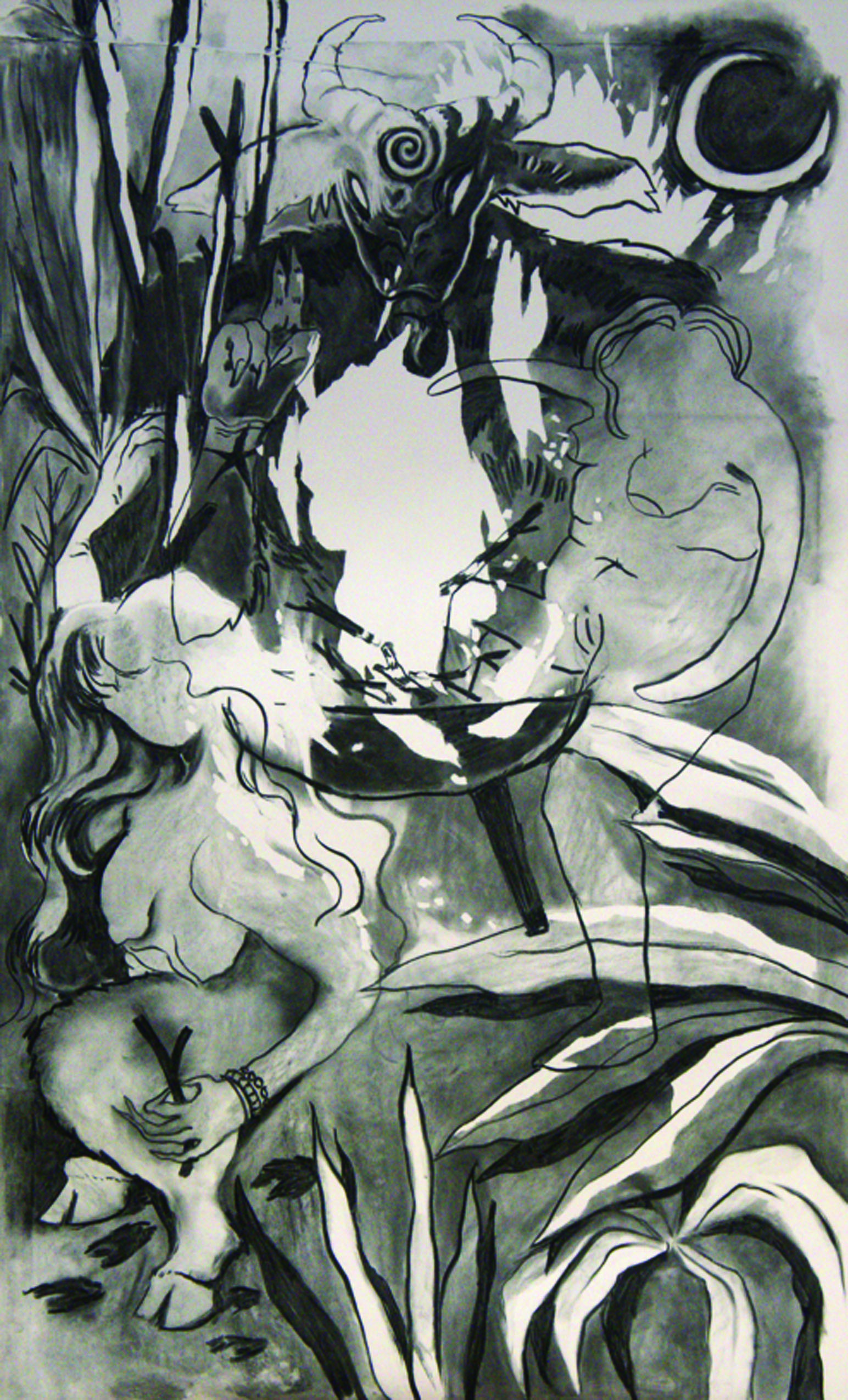 Le dessin, l’écriture, je les pratique dans la pénombre. Éclairée d’une lampe de chevet, mon stylo fuit de l’encre rose aux reflets lugubres. Je convoque un panthéon mental de figures puissantes, évocatrices. Des monstres de fantasy, des créatures mystiques, des personnages de mon invention ainsi que des piliers de l’iconographie religieuse mélangée au profane. Les carnets, je les chéris, car ils me ressemblent : ils contiennent de belles choses malgré des pages abîmées par les voyages et le manque de soin. Le dessin y fuse, l’écriture m’y déborde. J’extériorise mes peines et mes obsessions, je danse avec mes démons.